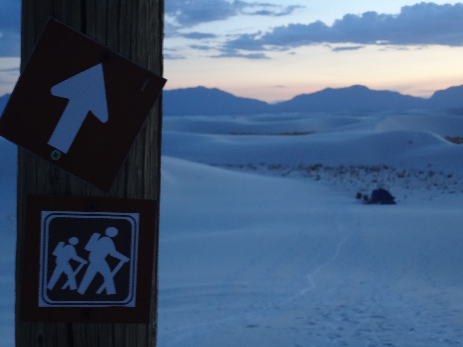 A trail marker pointing the way to the camp sites, with our tent in the background. :)